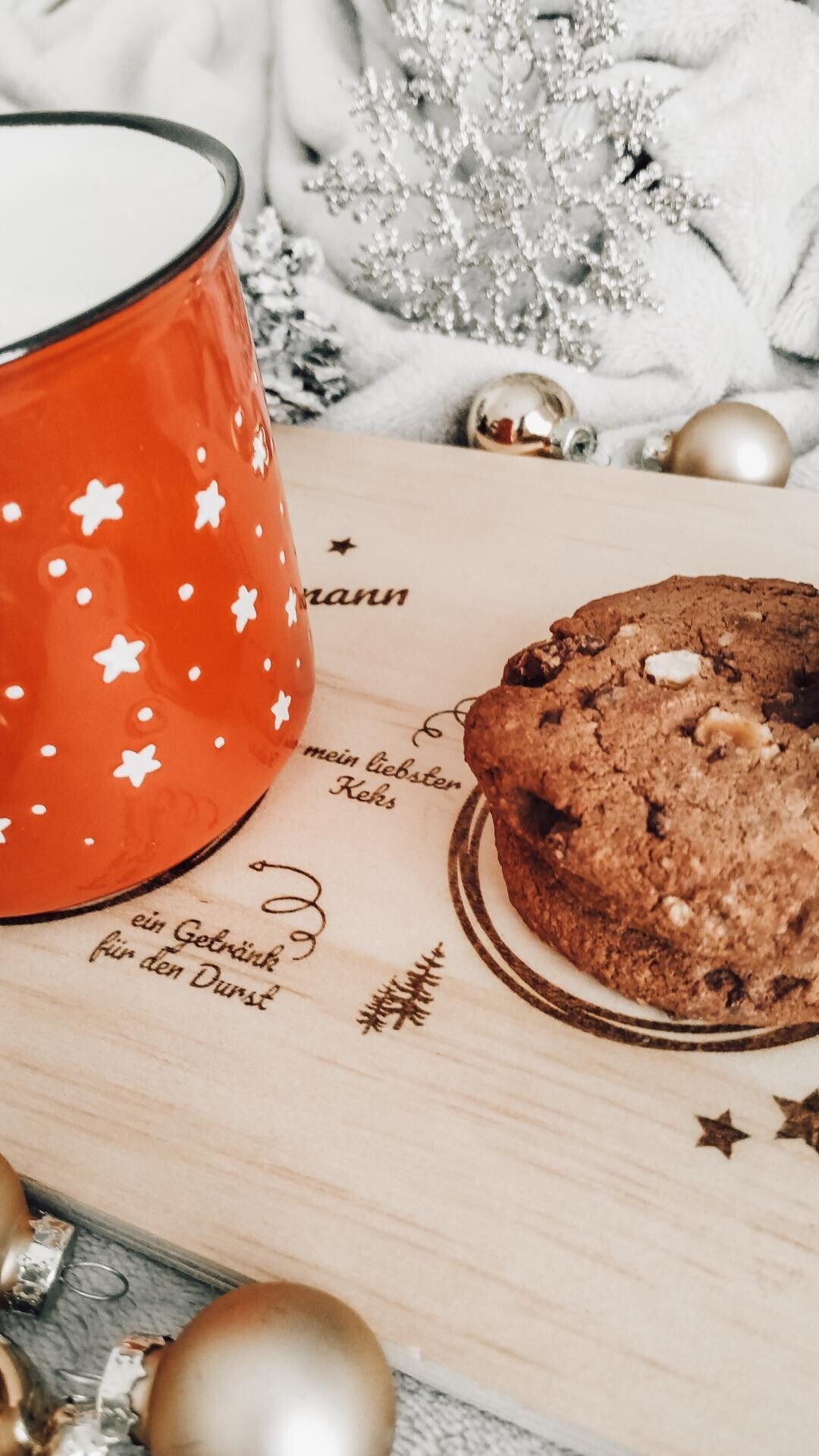 Stelle das Holzbrett an Heiligabend in die Nähe des Weihnachtsbaums und stelle ein Glas Milch und einen Keks darauf.