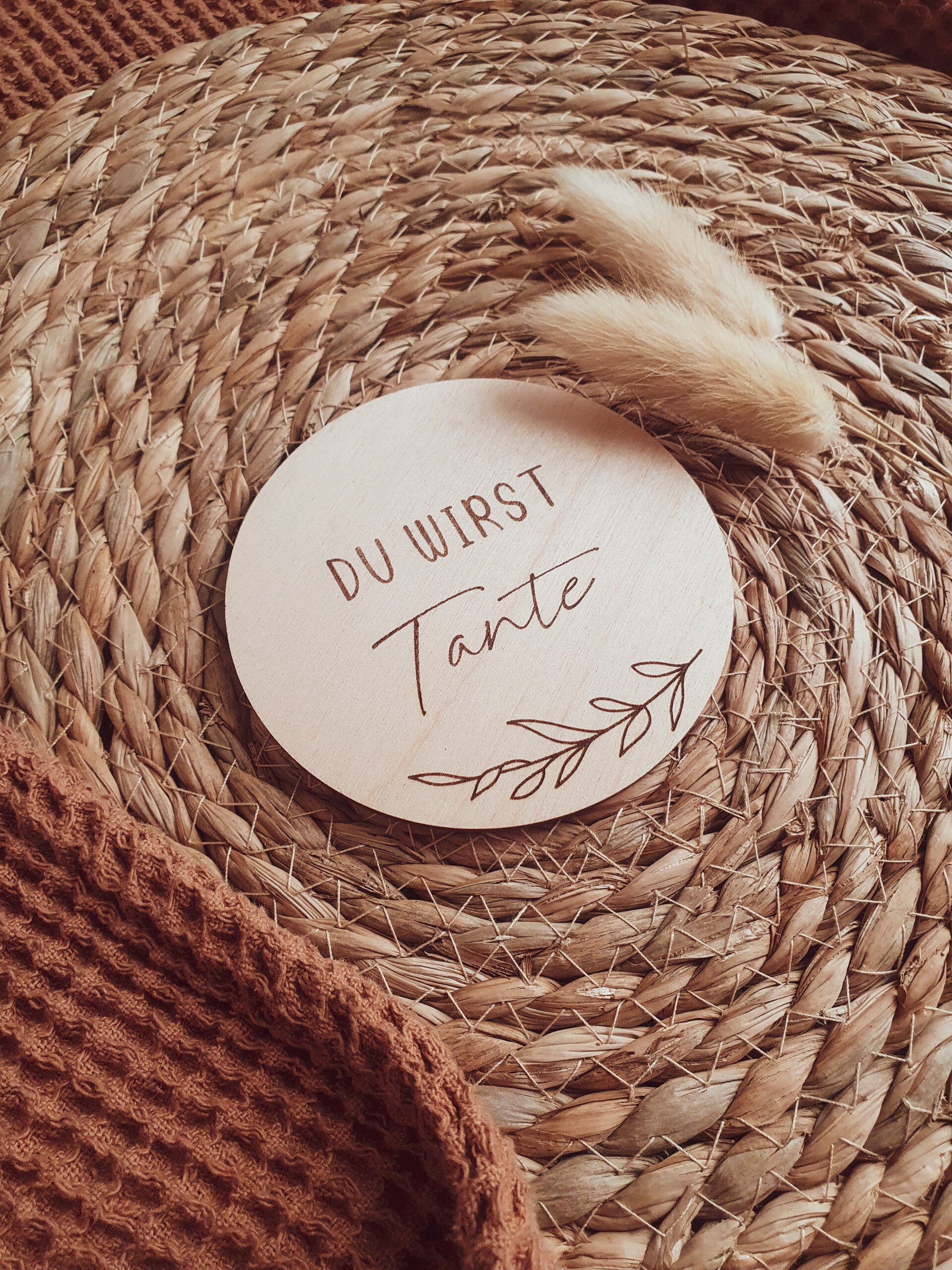 Eine laser gravierte Holzscheibe mit dem Spruch „Du wirst ...“, mit der ihr eure Schwangerschaft verkünden könnt.
