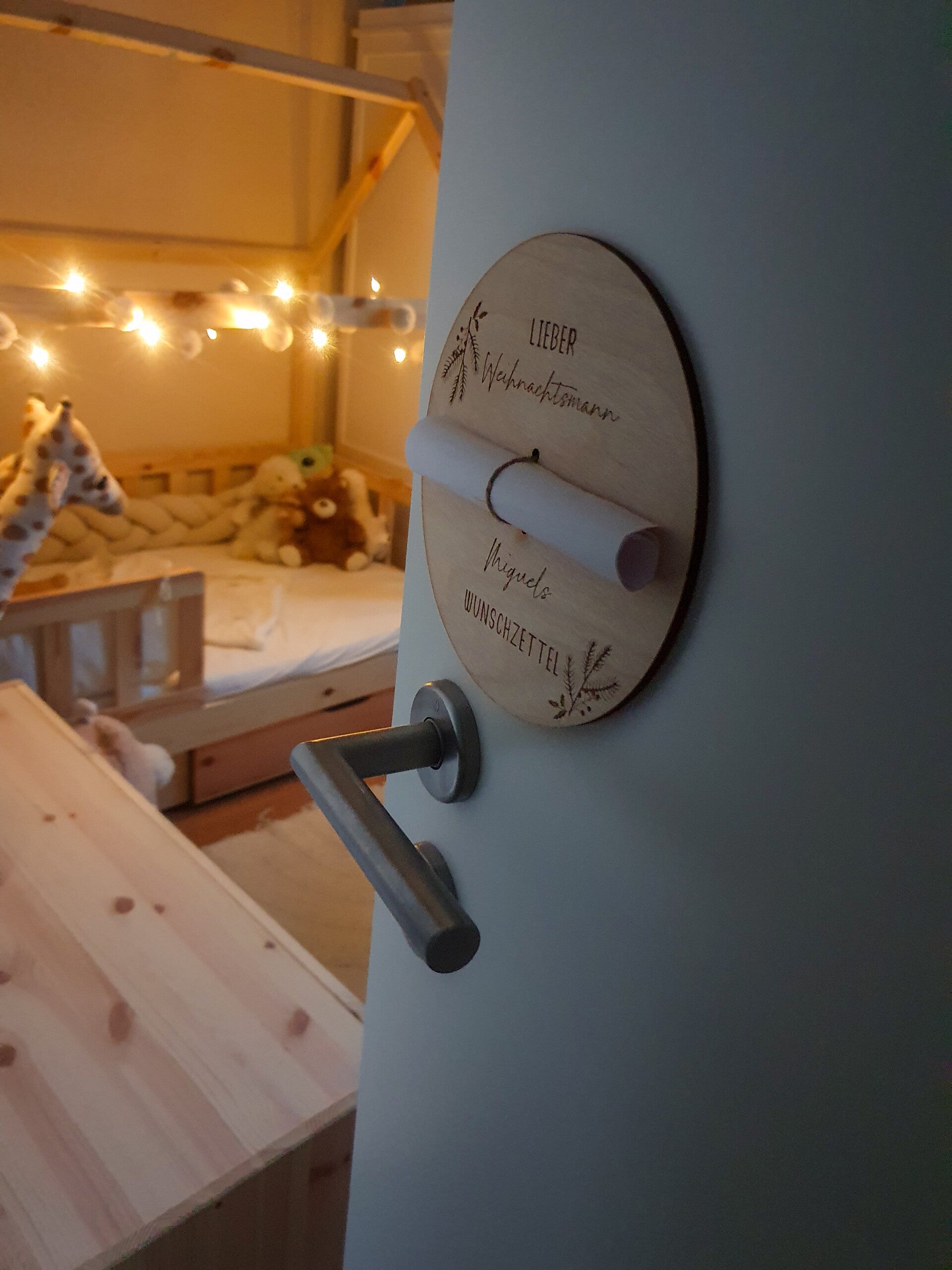 Die Wunschschriftart bezieht sich auf den Wunschnamen und die Variante. In der Mitte der Holzscheibe sind zwei Löcher um den Wunschzettel zubestigen.