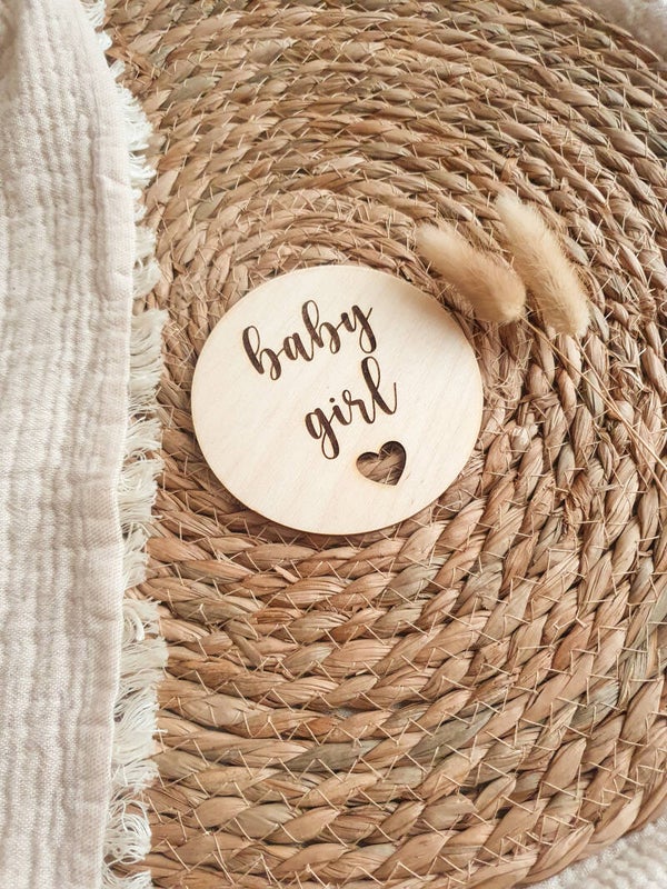 Eine laser gravierte Holzscheibe mit dem Spruch „baby girl“, mit der ihr aufregende & emotionale Ereignisse kreativ festhalten könnt.